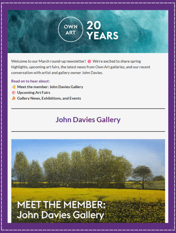 We are delighted to have you as a member and look forward to working with you to help more people Own Art. On this page you can find details about the range of ways we can support you to get the most out of you Own Art membership. This includes promoting your gallery, on-demand courses, exclusive offers and discounts and support from our dedicated team of Own Art experts.